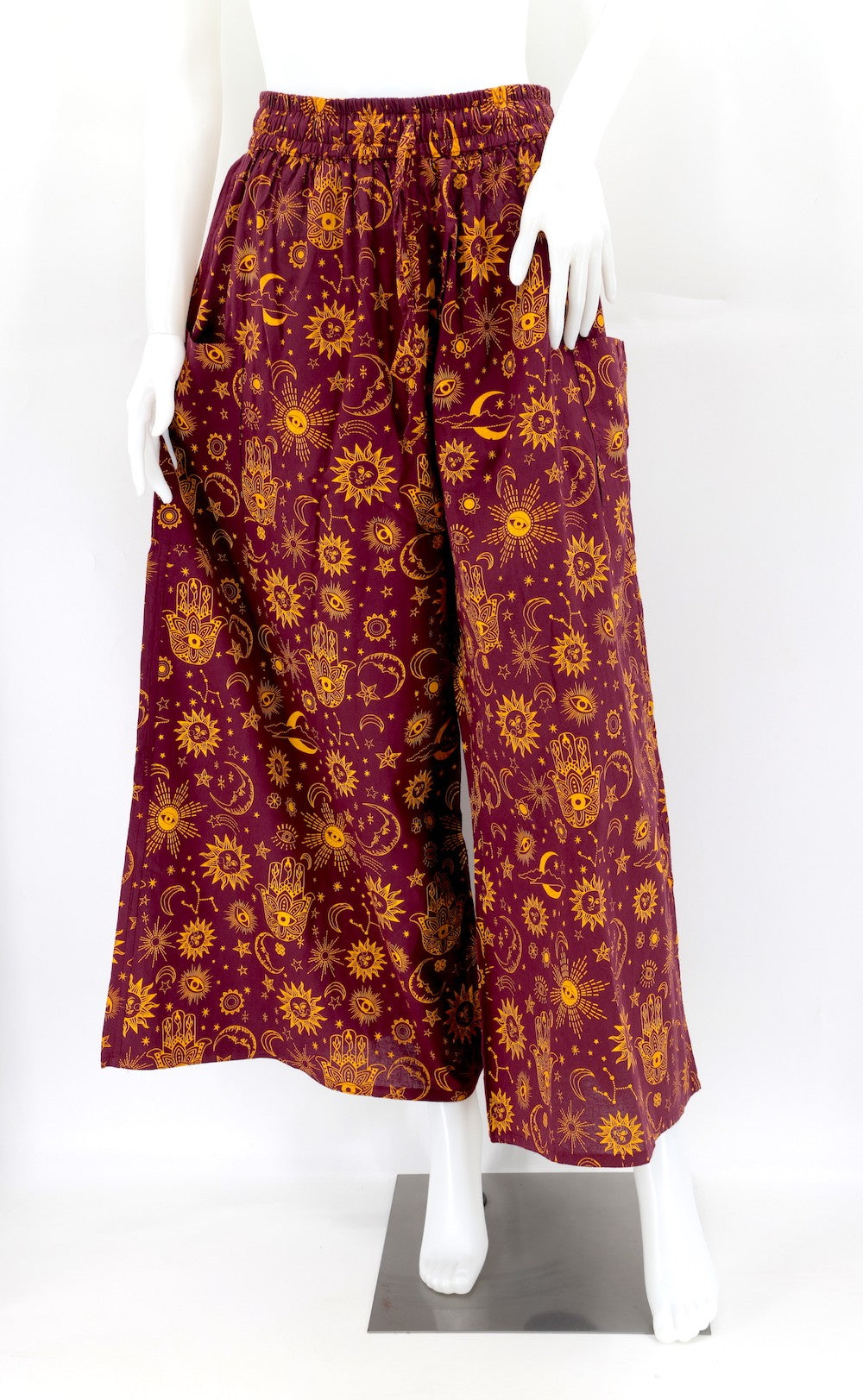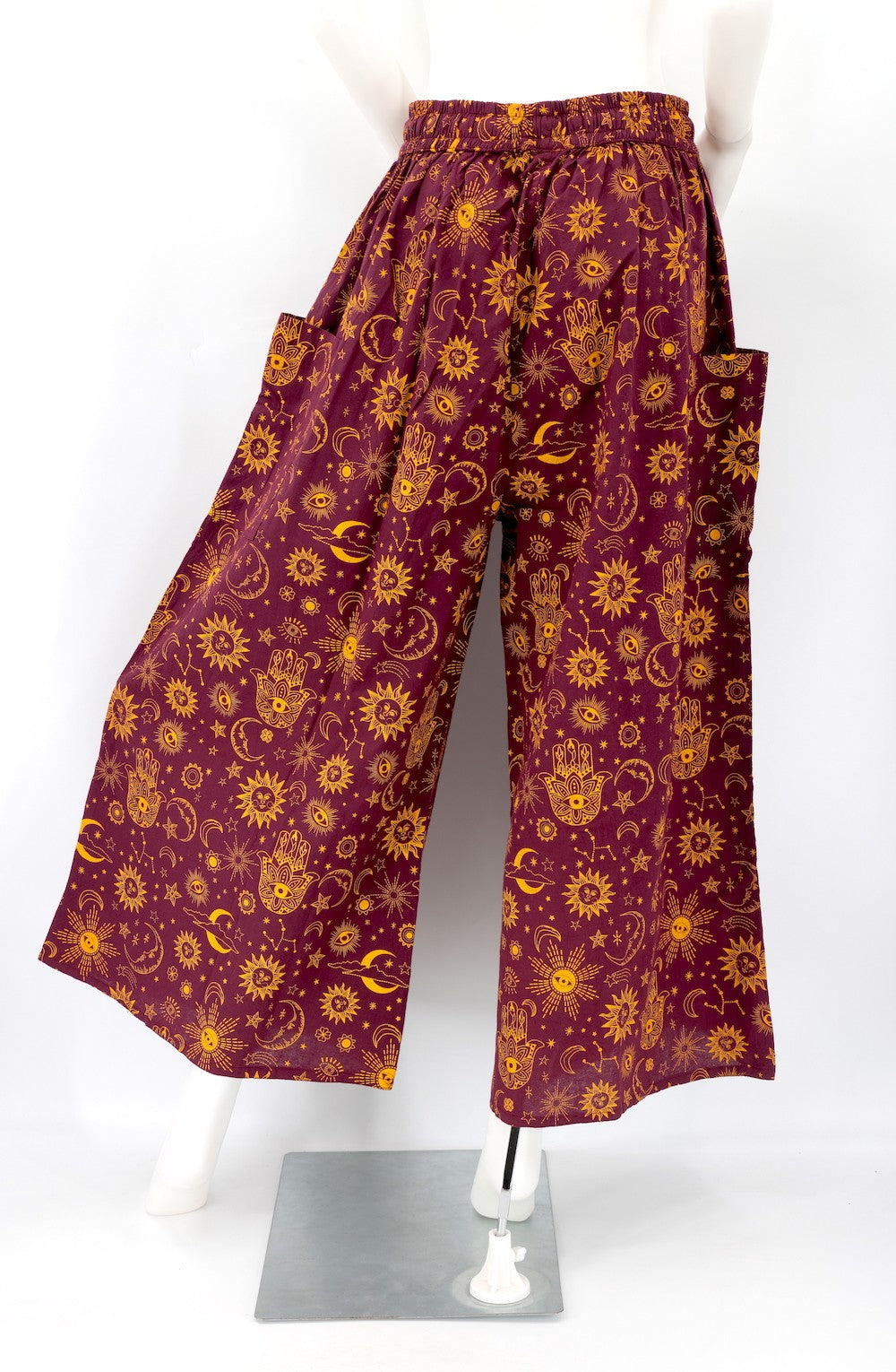 Wrap yourself in cosmic elegance with our Burgundy Celestial Palazzo Pants. Featuring a sweeping wide-leg cut and a mesmerizing golden print of suns, moons, and Hamsa hands, these pants offer the ultimate in comfort and mystical style. The lightweight, flowy fabric and adjustable elastic waist make them perfect for festivals, beach days, or simply relaxing in style.