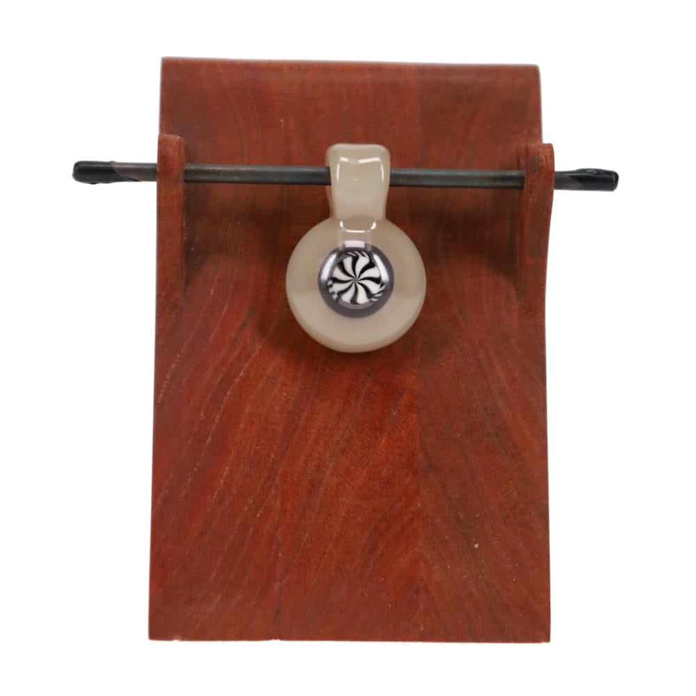 This pendant features a black and white millie and is also shifty in different lighting. Depending on which type of light you are in, the pendant will change in between 2 colors.