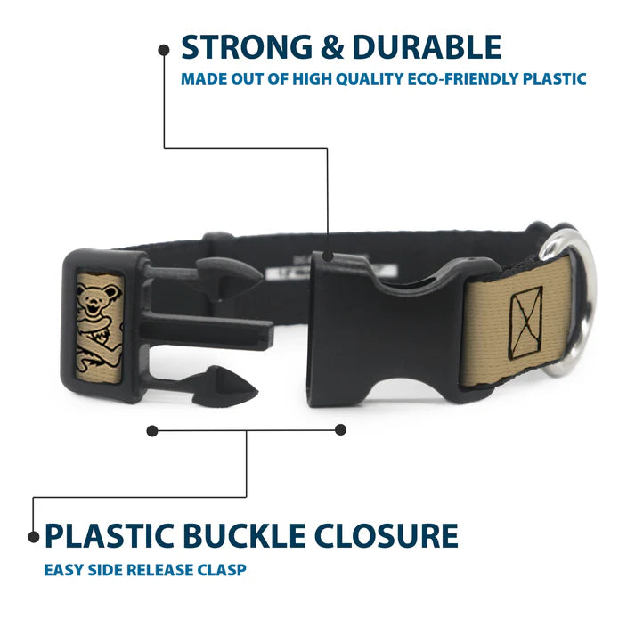 Vibrant and bold, this beautiful, polyester dog collar is made to show off your dog's unique style through all the seasons. With an overengineered plastic buckle and strong D-ring, this durable collar can hold up to whatever your dog can dish out. This product is officially licensed by Grateful Dead.