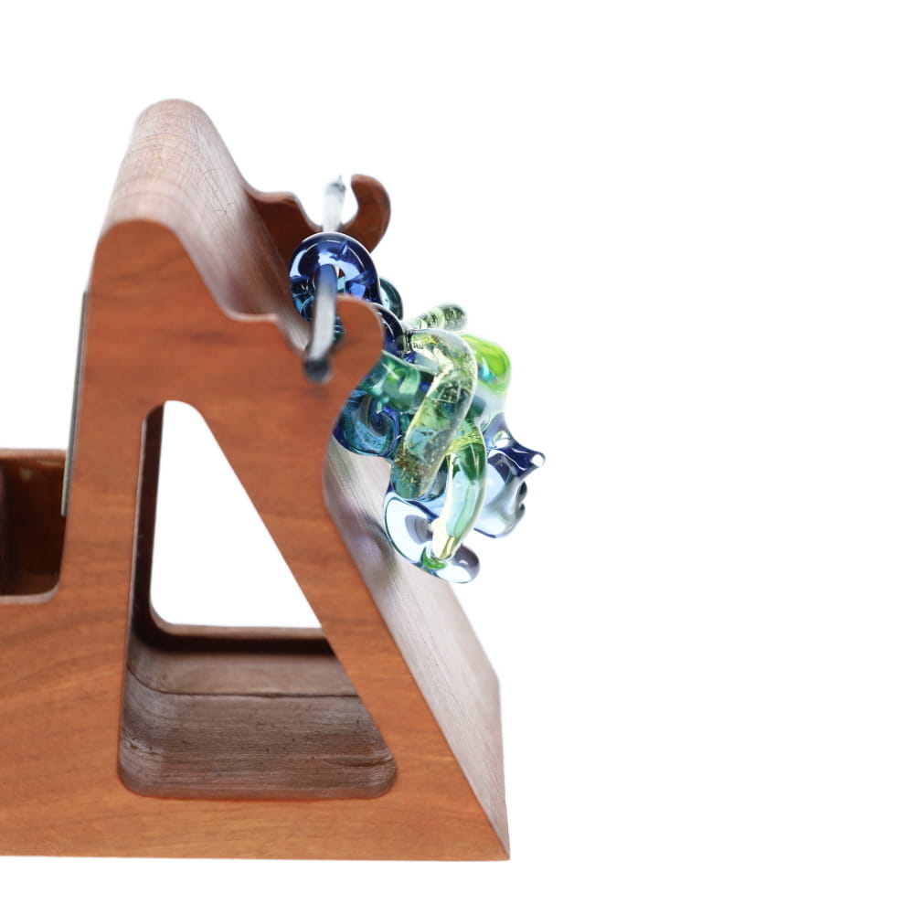 One of America's most respected and sought after artists on the torch, Laceface's work always stands out with her color combinations. This Warrior Queen pendant is sure to be noticed while on and a definite conversation starter. It is considered a "mini" because it is smaller than her classic size queens. This pendant is the perfect size for those wanting a heady pendant in a more petite version. (See dimensions below.) It is UV which means it will glow in a blacklight and has a combination of shades of Blue glass colors and finishes with an Opal. It is crafted to perfection and lays perfectly while being worn.