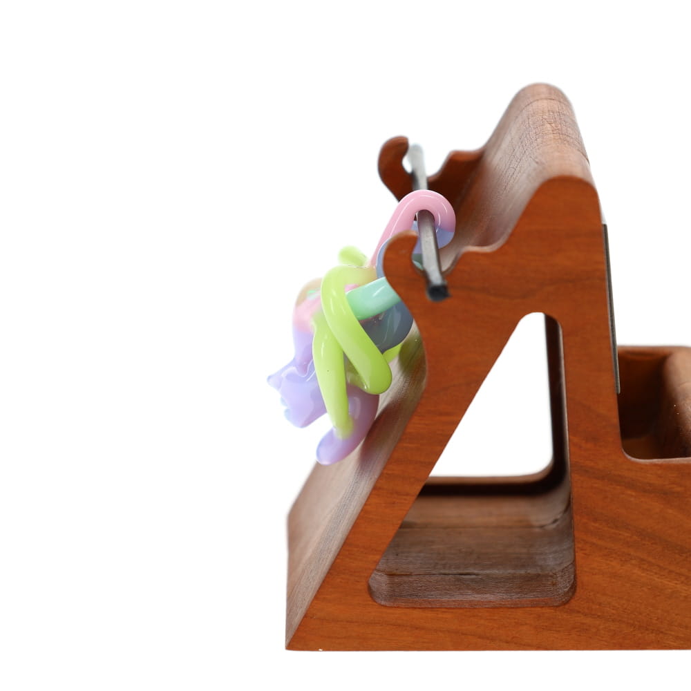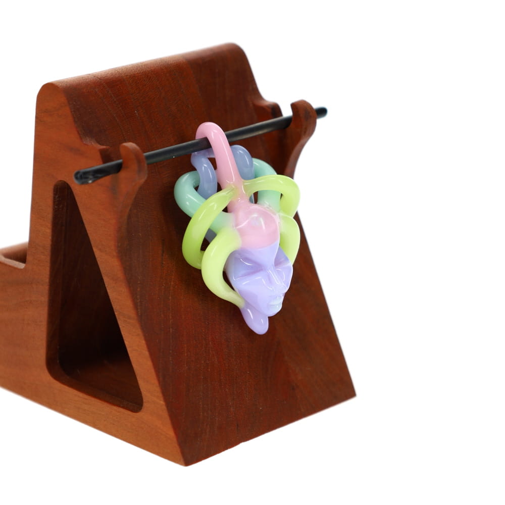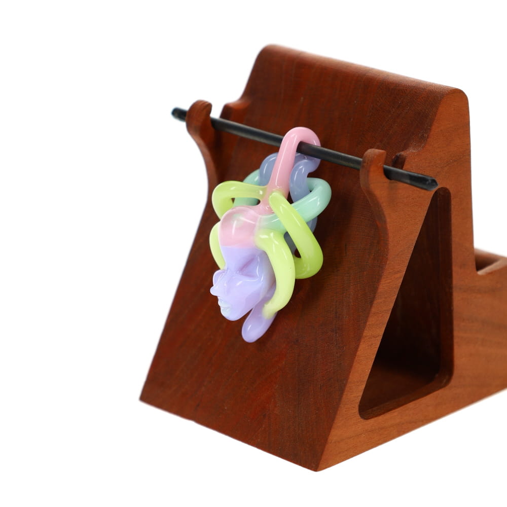 One of America's most respected and sought after artists on the torch, Laceface's work always stands out with her color combinations. This Warrior Queen pendant is sure to be noticed while on and a definite conversation starter. It is considered a "mini" because it is smaller than her classic size godesses. This pendant is the perfect size for those wanting a heady pendant in a more petite version. (See dimensions below.) It has a combination of Pastels including Green, Blue, Purple & Pink glass colors and finishes with an Opal. It is crafted to perfection and lays perfectly while being worn.