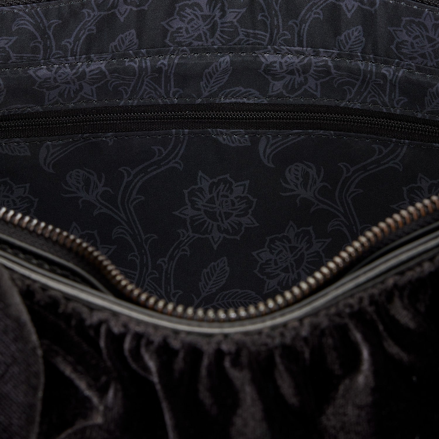 This tote bag is the Disney Villain fashion statement you've been looking for. This bag features a velvet ruffle along the top. Below, you'll find stained-glass-style windows with 3D embroidery that depicts your fav Disney Villains. Metallic faux leather, a velvet bow, and a detachable coin bag bring the whole look together.