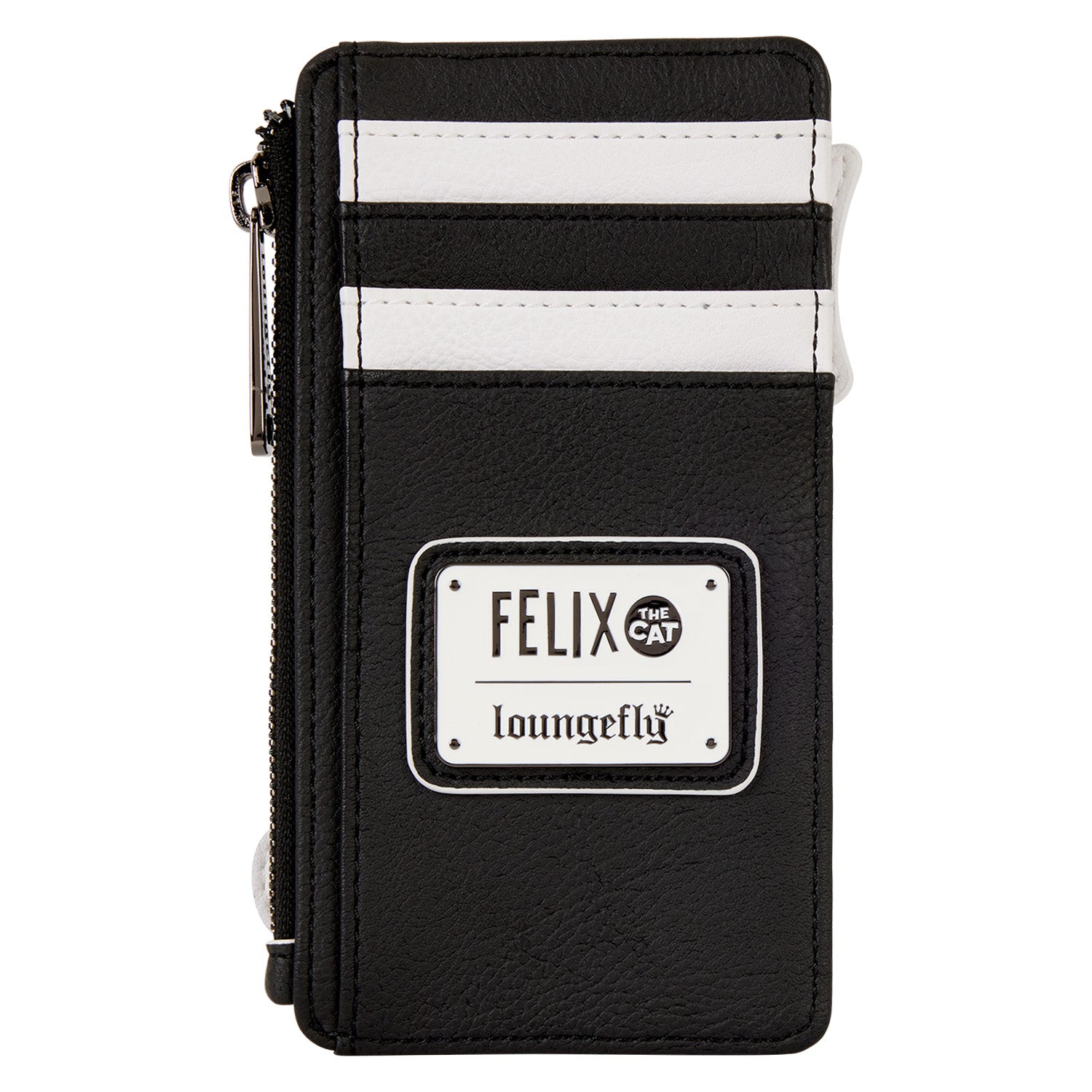 On the front, you'll find an applique of Felix the Cat with his hands on his stomach and leaning back as he laughs. The background is black-and-white checkered. Turn the card holder around to find four black-and-white card slots and a zippered compartment to store small essentials.