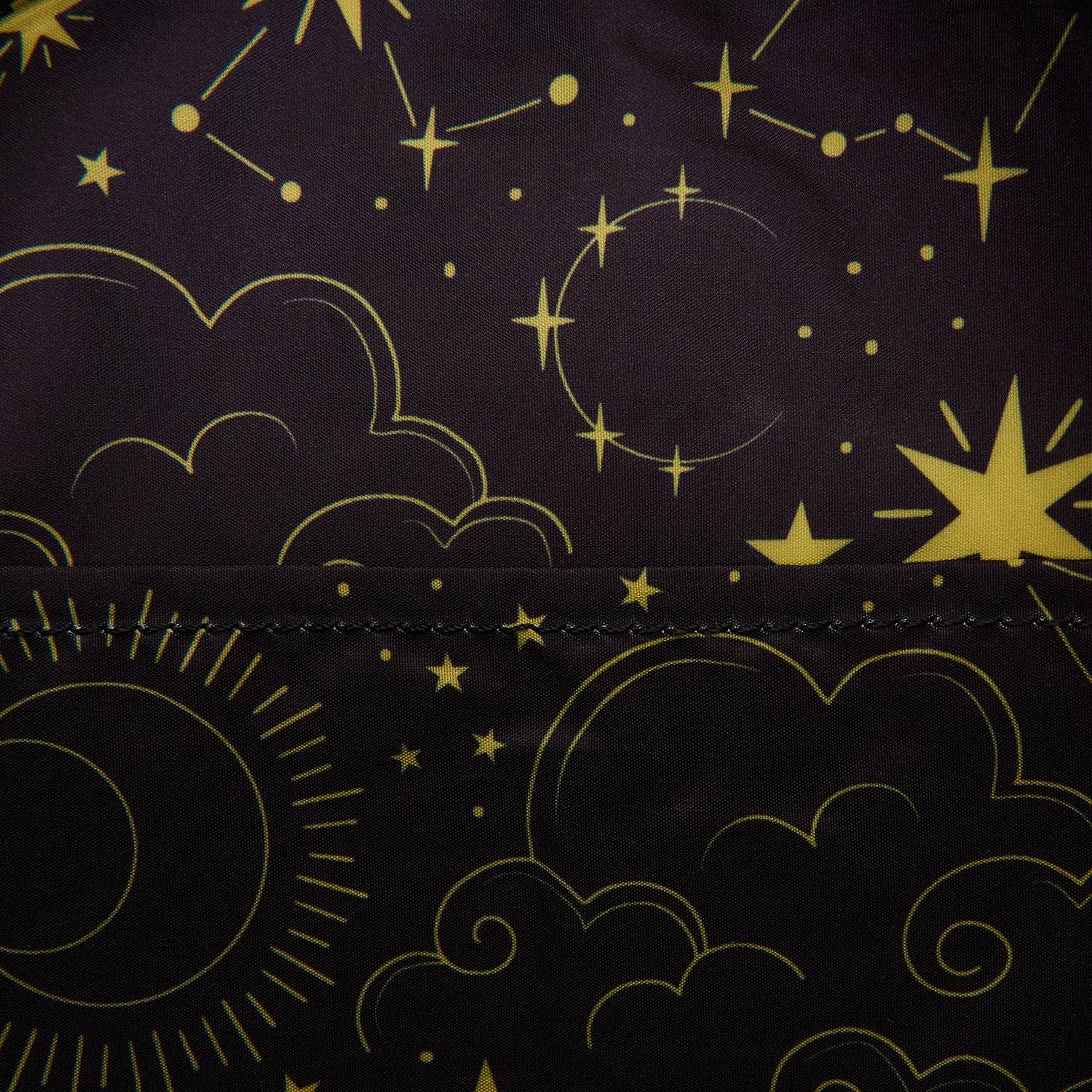 This crossbody bag is ready to make a statement with anything in your wardrobe! It's circular and features a sun and moon nestled together. Turn the bag around to find sparkling stars in a cloudy night sky. Metallic faux leather really makes the details pop!