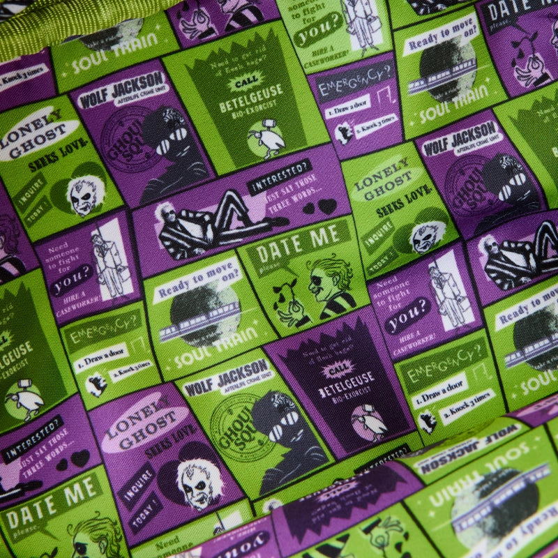 Co-ghost a show in style! Take along our Beetlejuice Beetlejuice crossbody bag featuring Lydia Deetz’s haunting television program. Frightful fun is in the details, which include appliques of eerie-looking ghosts on the front pocket and hovering above. The logo for Lydia’s show, which includes a spooky house and the words “Ghost House with Lydia Deetz,” appear below. Flip the bag around, and more ghosts materialize around the word “Ghostie.” In the dark, all lettering and images glow! Pack your daily essentials and prepare for spine-tingling adventures.