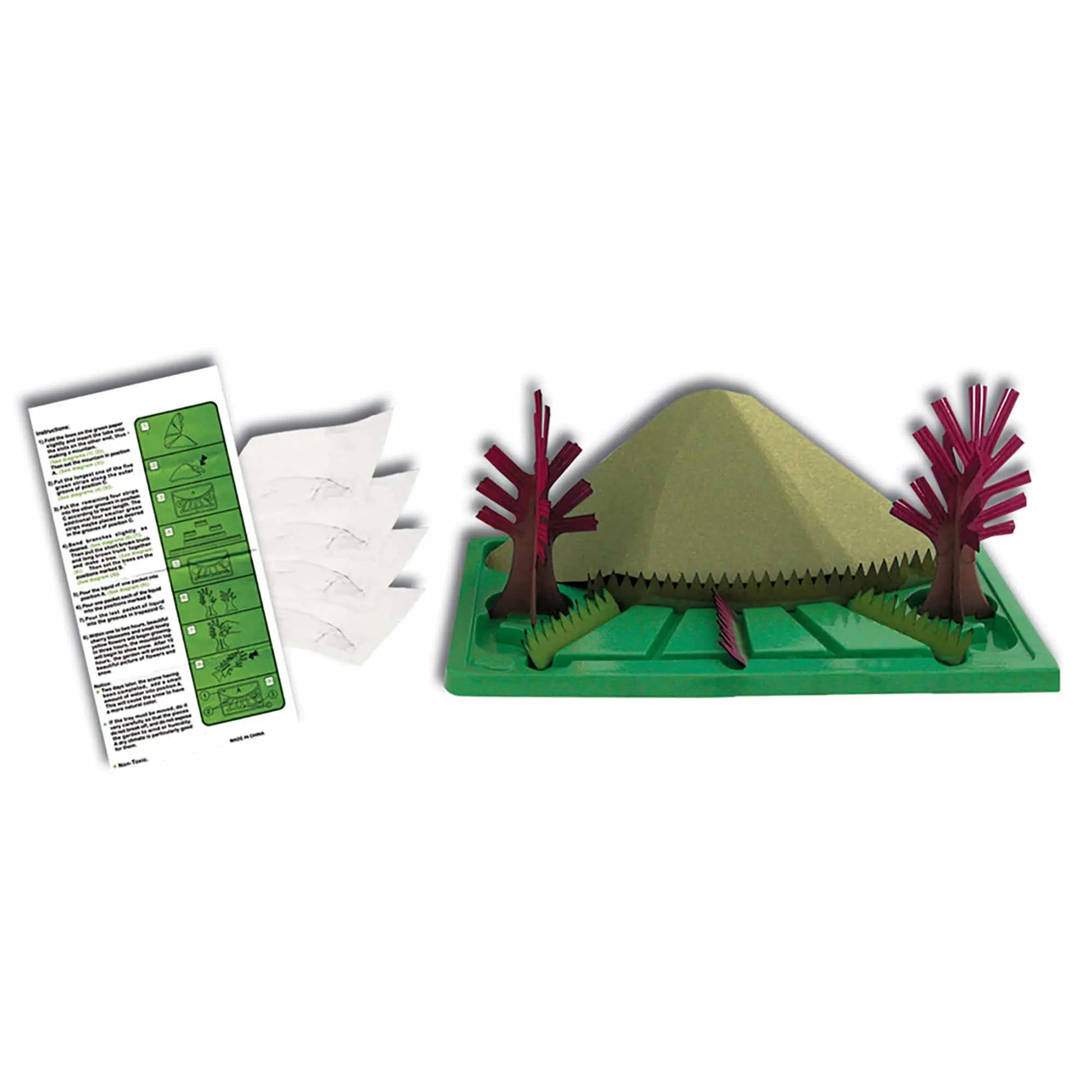 Grow your very own crystal garden! Watch this beautiful landscape grow like magic! Mix the ingredients in the kit and pour. Within a few hours the trees and flowers will begin to bud and snow will start to form on the mountain before your very eyes.