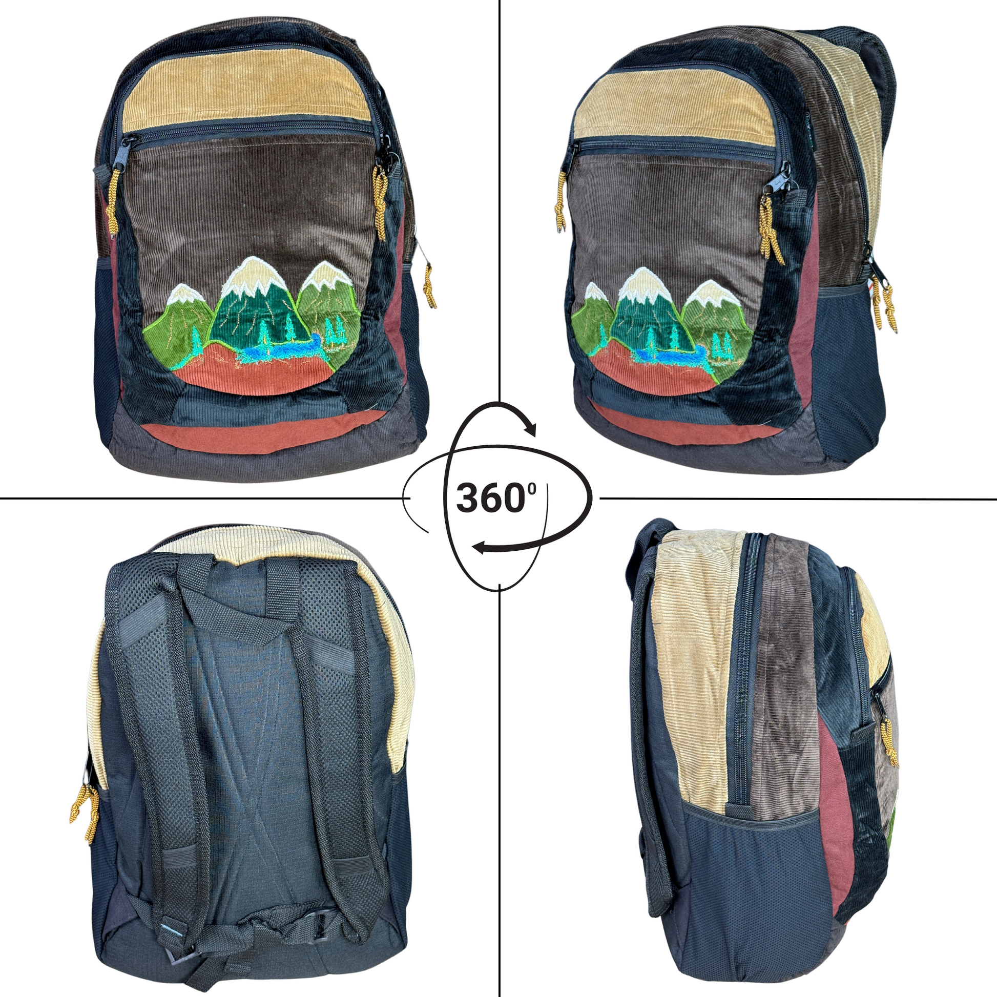 - Mountain Appliqué Design – Features a bold mountain design made from layered fabric (appliqué), sewn onto soft corduroy—each pack is a one-of-a-kind statement piece.