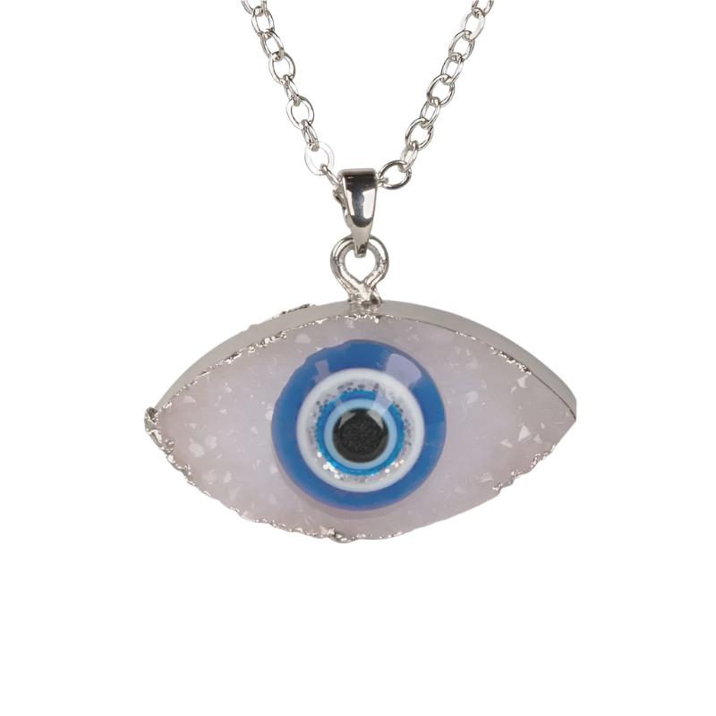 This evil eye inset druzy pendant is 1.25" x 0.75" and the chain is 17.5".