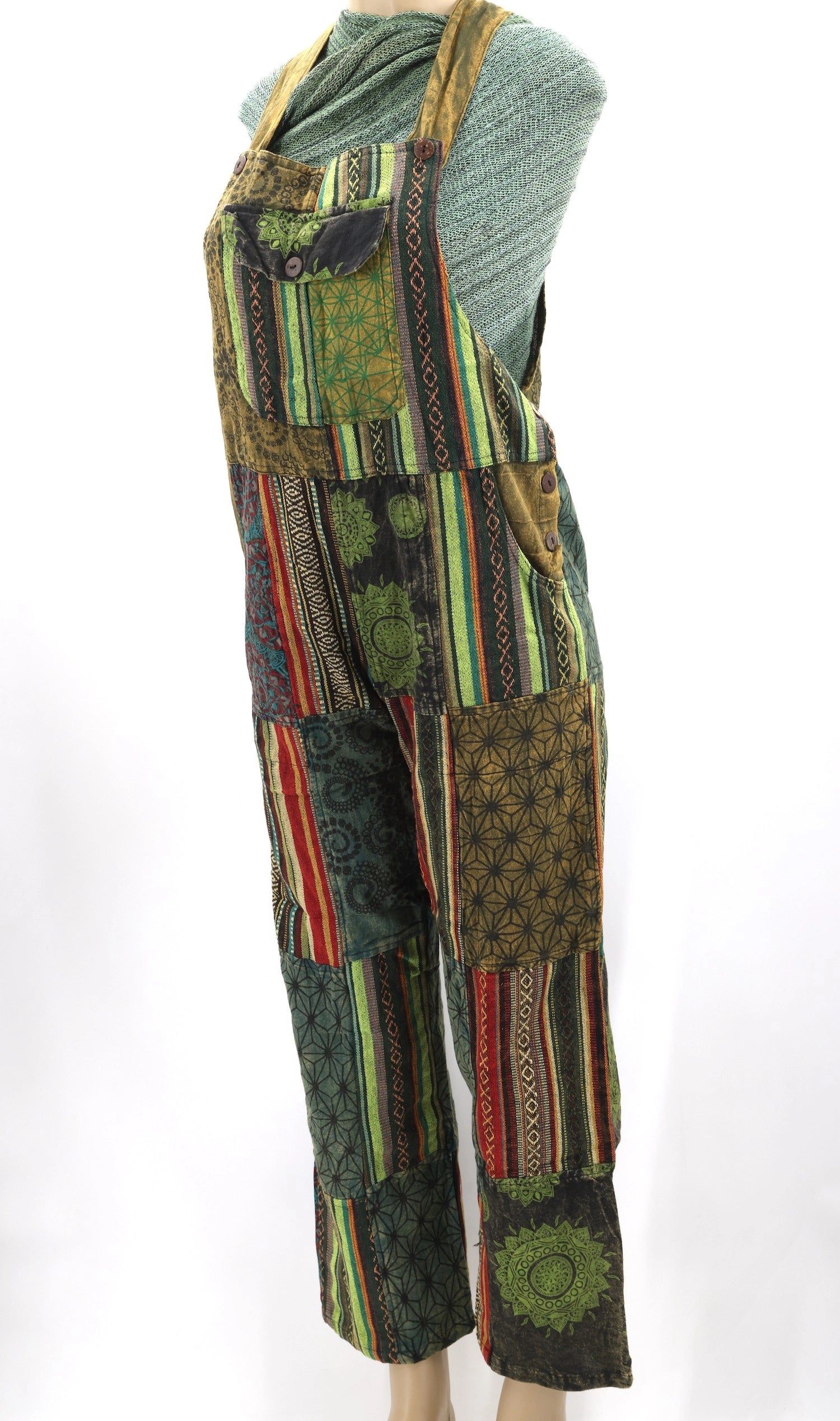 What makes the multi-patched overall special is that it is handmade in Nepal and made to fit people of all sizes. Available in 3 sizes: