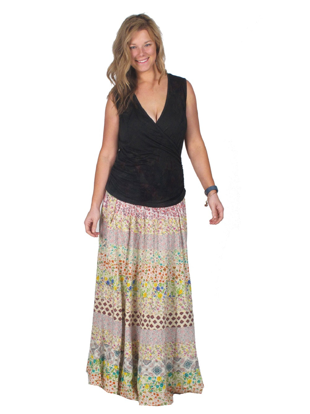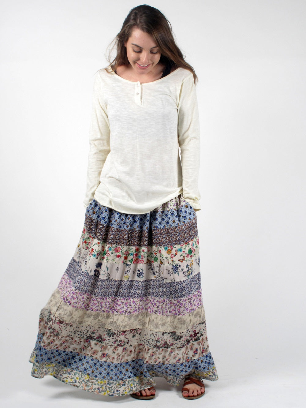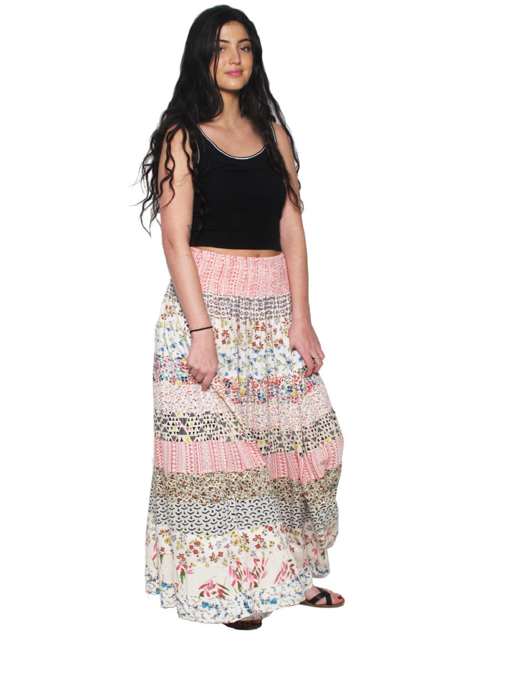 Tiered rayon patchwork skirt with smocked top and pockets.