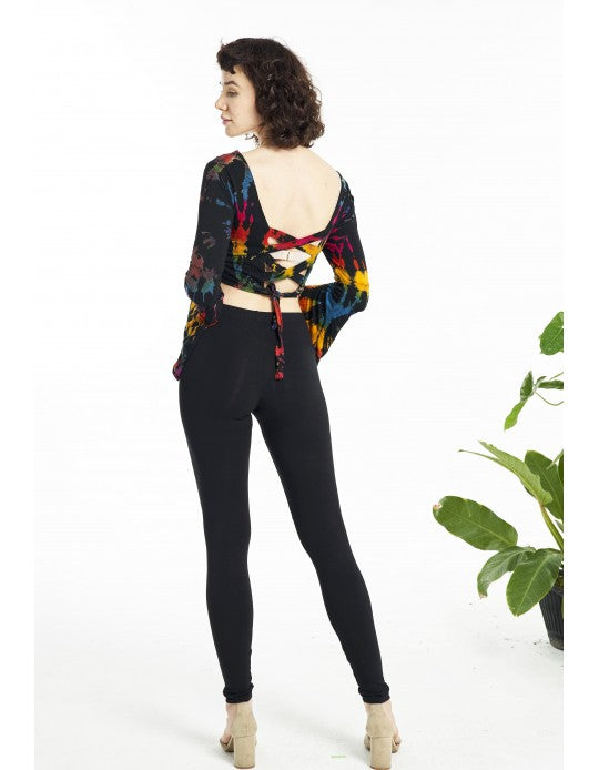 Tie Dye Long Bell Sleeve Crop Top with Lace up Back - Black Rainbow